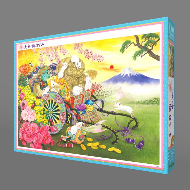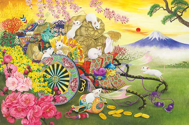 • 這幅吉祥圖適合十二生肖的開始,八隻白老鼠向末尾散開,堆積如山的寶物,隨風搖曳的垂櫻和羽衣,讓人感受到生機勃勃的氣息。